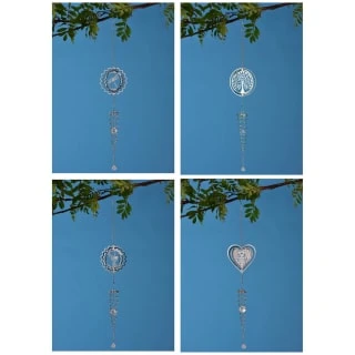 Hang this shiny spiral metal wind spinner with crystals around your gaden, and watch it glisten and shine in the sun.